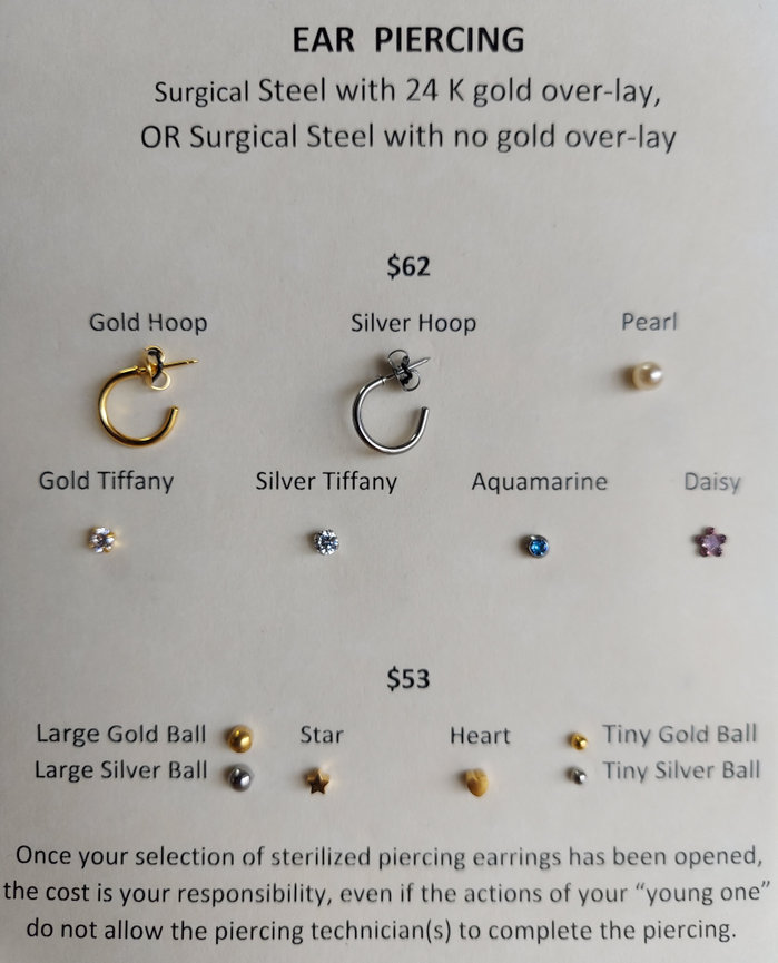 * Once your selection of sterilized piercing earrings has been opened, the cost is your responsibility, even if the actions of your "young one" do not allow the piercing technician(s) to complete the piercing. We will not force anyone to be pierced, even after the earrings are open!